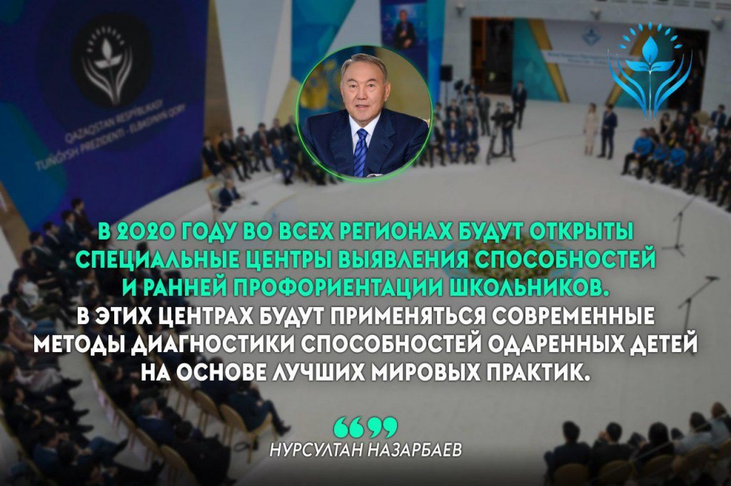 Біз студенттердің қабілеттері мен кәсіби бағдарларын анықтайтын кешенді жүйені құрамыз. 2020 жылы барлық өңірлерде оқушылардың қабілеттерін анықтау және мансаптық бағдарлау бойынша арнайы орталықтар ашылады. Бұл орталықтар әлемдік озық тәжірибеге негізделген дарынды балалардың қабілетін диагностикалаудың заманауи әдістерін қолданады », - деді Қазақстанның Тұңғыш Президенті